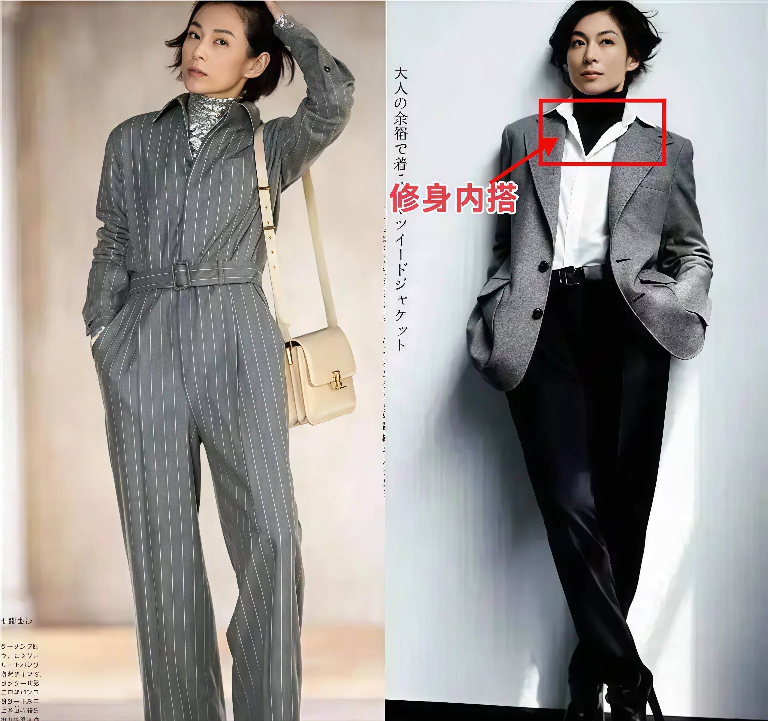 西装单穿很容易显得正式、刻板,尤其是在日常场合,穿一身西装走在街上总有种要去面试 的感觉。但铃木保奈美把西装穿出了休闲感,她的方法很简单,就是在西装里面搭一件高领的修身内搭,这件内搭可以是针织的,也可以是棉质的,重点是要贴身、有弹性、领口是高领。高领的好处是它能把脖子包裹住,让整个头颈的线条变得修长,而修身的版型又不会给西装增加额外的厚度,这样敞开穿的时候,能看到里面干净利落的一条竖线,拉长整个人的身形。