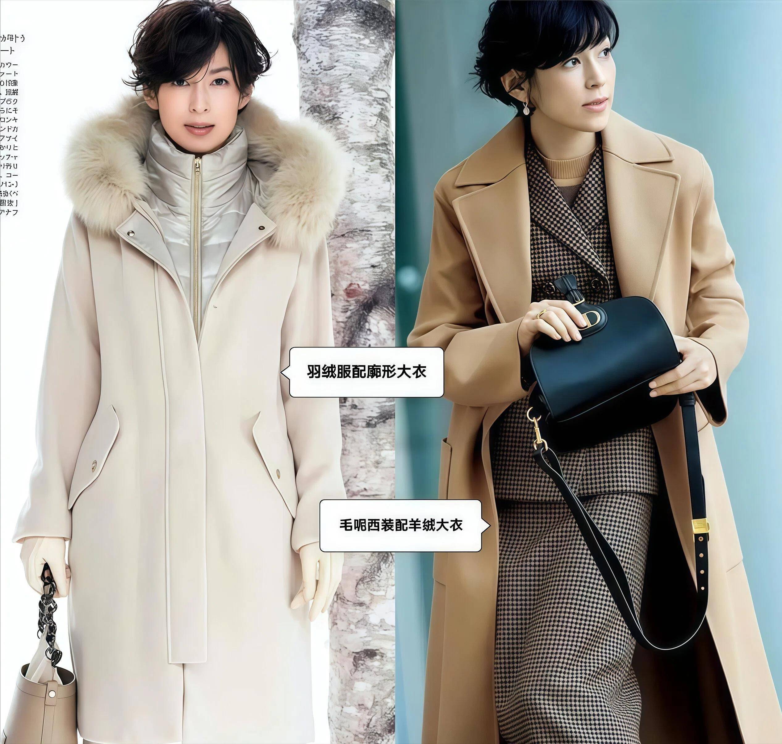 铃木保奈美的做法是把轻薄的羽绒服或者西装外套当做中间层穿在里面,外面再套一件版型挺括的大衣,这样既保暖,又能靠大衣的外轮廓撑起整个人的线条。这种穿法的关键是大衣一定要选直筒或者H型的,肩线要撑得住,不能是那种软塌的面料,不然盖不住里面的厚度,反而会显得更臃肿。