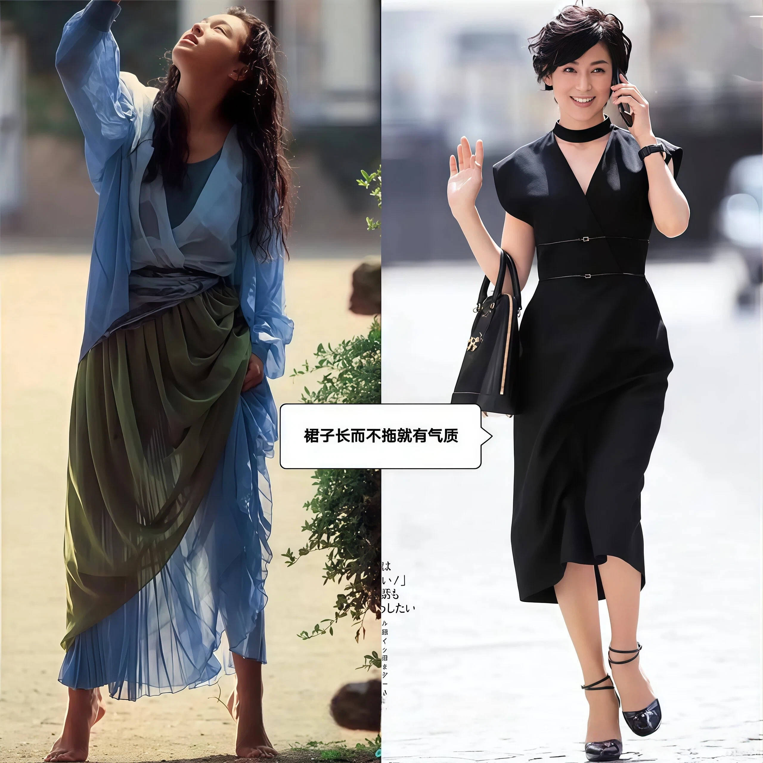 长裙也不能太长,尤其是那种拖在地上的款式,日常穿真的非常灾难。裙摆拖地会扫到地面的灰尘和水渍,走几步路裙边就脏了,还会有一种拖泥带水的感觉,整个look的动态变得很沉重。更重要的是,裙子一旦拖地,你的腿长就完全被裙子吞掉了,别人看不到你的脚在哪里,就会下意识地觉得你的腿很短,露出脚踝能显高,盖住脚踝会显矮,拖地就更不用说了。