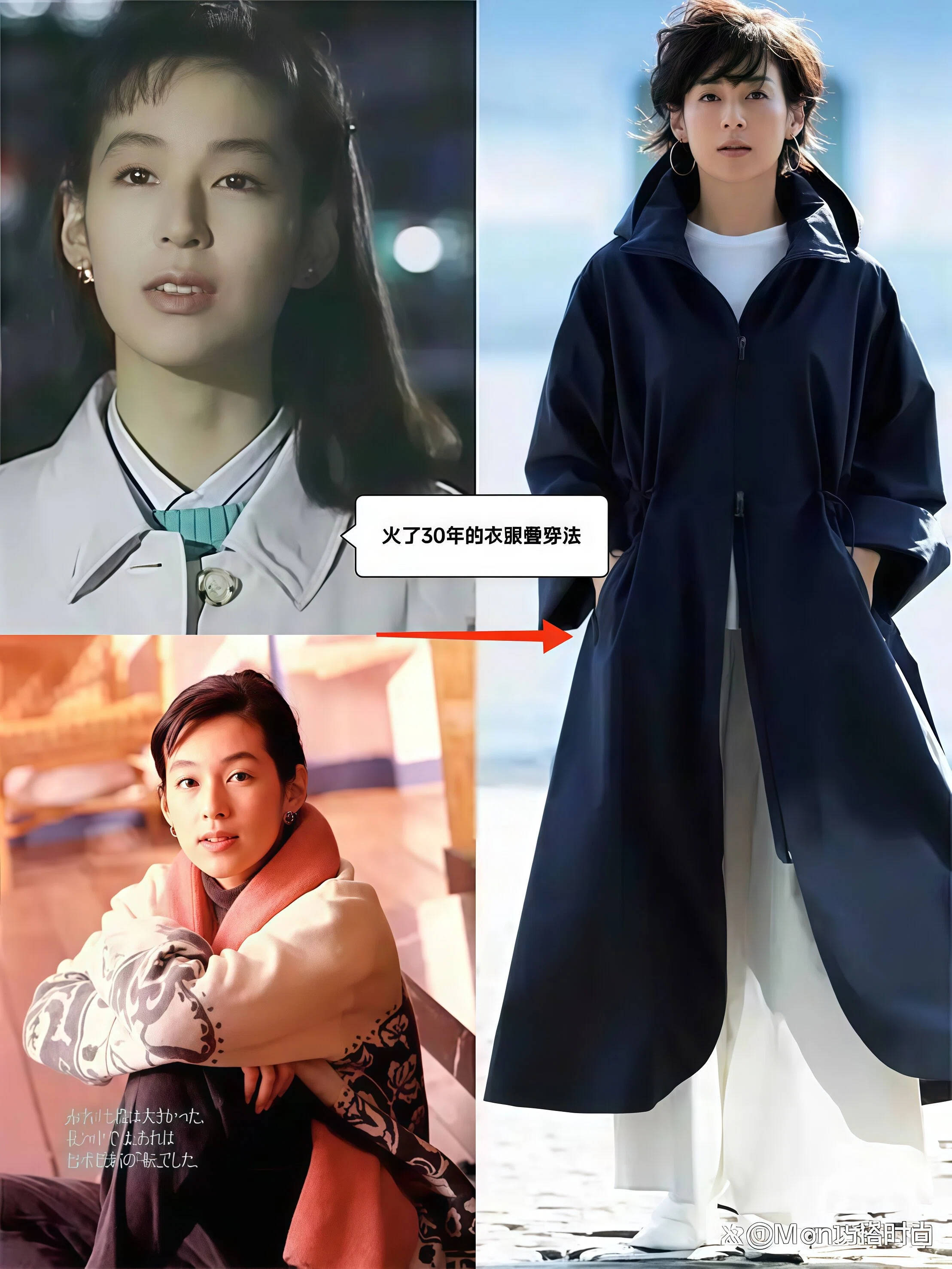 很多女演员年轻时候穿得好看,是因为身材底子好、脸够扛,但二十年后再翻出当年的照片,多半会觉得土气扑面,因为那时候穿的不过是当季流行款,过了那个时间点就成了时代的眼泪。铃木保奈美不一样,她30年前的穿搭照片今天翻出来看,那些大衣的版型、叠穿的层次、裙子的长度,跟现在时尚博主反复强调的“高级穿搭法则”几乎一模一样。她从不追求“这一季最火的单品”,而是专注于什么样的结构和比例,能让自己看起来更好,所以她的审美不会被时间淘汰。